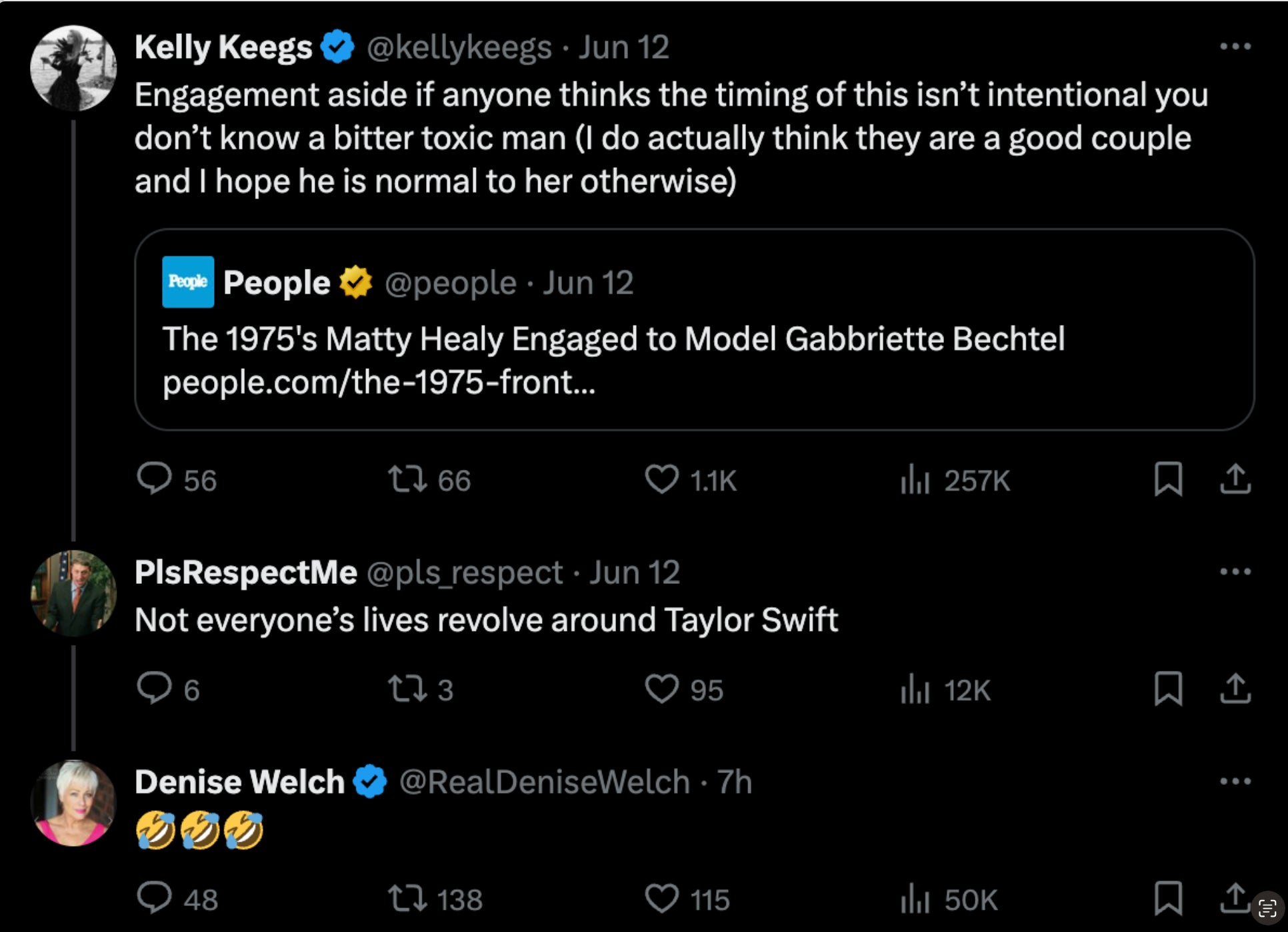 Floored. Now, there are a few sides to this. I of course, casually throw my thoughts out on Twitter and normally don't think about the repercussions, especially when it's something like this. I'm talking some light shit on a People.com quote tweet, and somehow Denise Welch is going through my replies and commenting on them??? INSANITY. In the middle of everything that's going on with Taylor Swift, I do believe that this random surprise engagement announcement hours before Taylor Swift's 100th eras tour show, rumored to be star studded and full of surprises….was to, quote, "ruin a sparkling summer." I don't know any of these people personally, I don't know their lives, but I know petty when I see it. When it comes down to it, whether it's the truth or not, is irrelevant. I'm just a random bitch on Twitter who loves Taylor Swift.